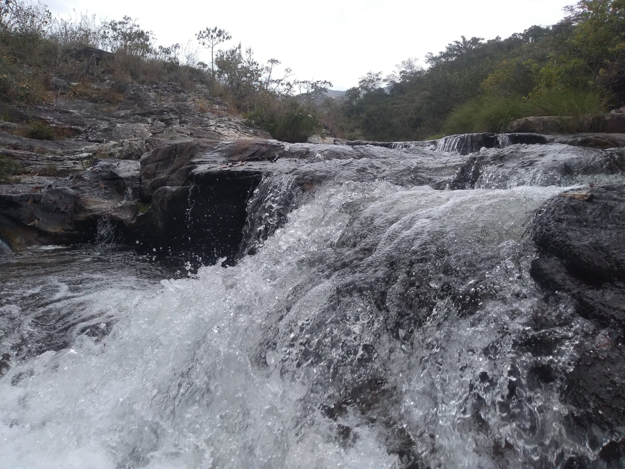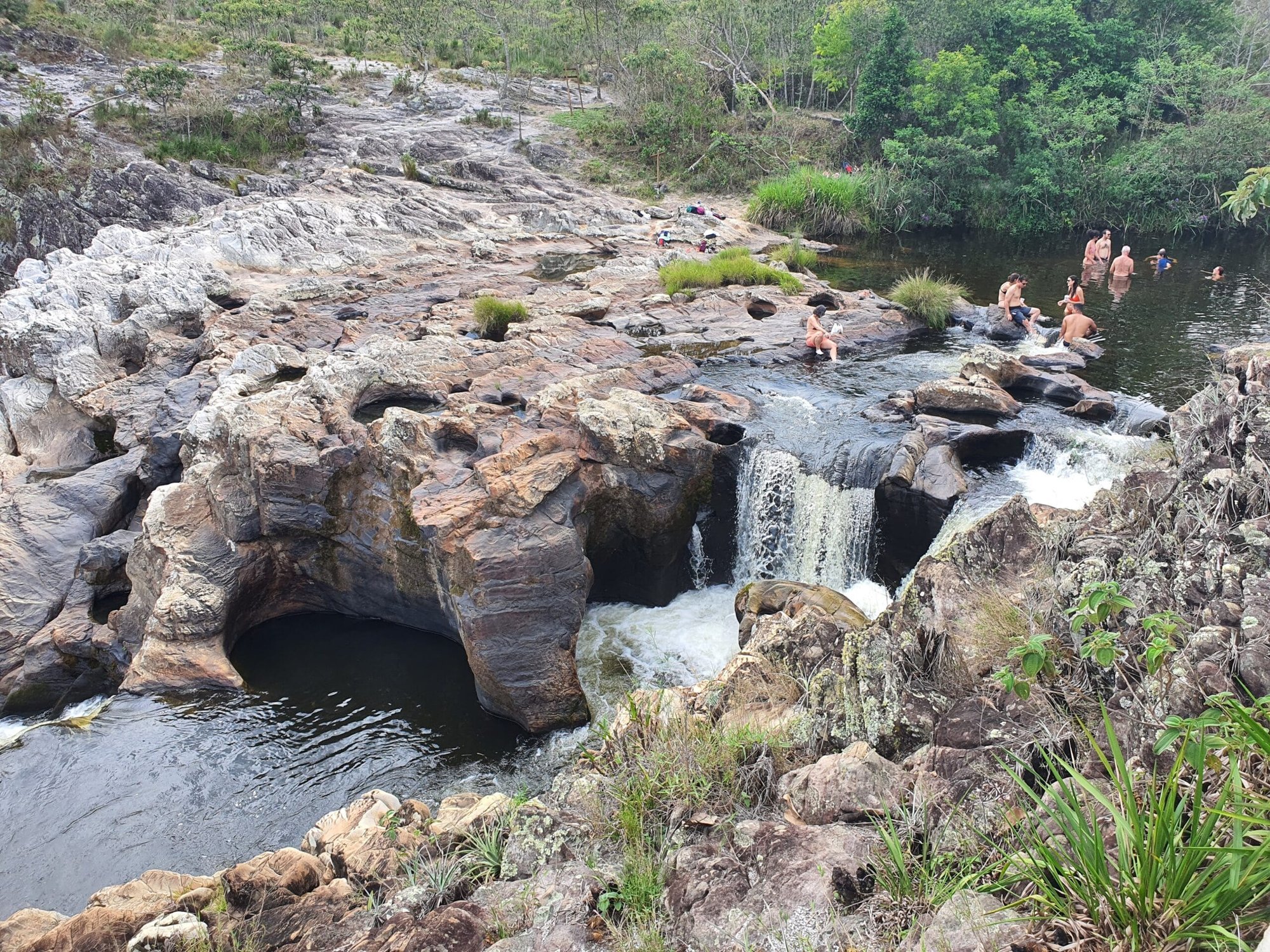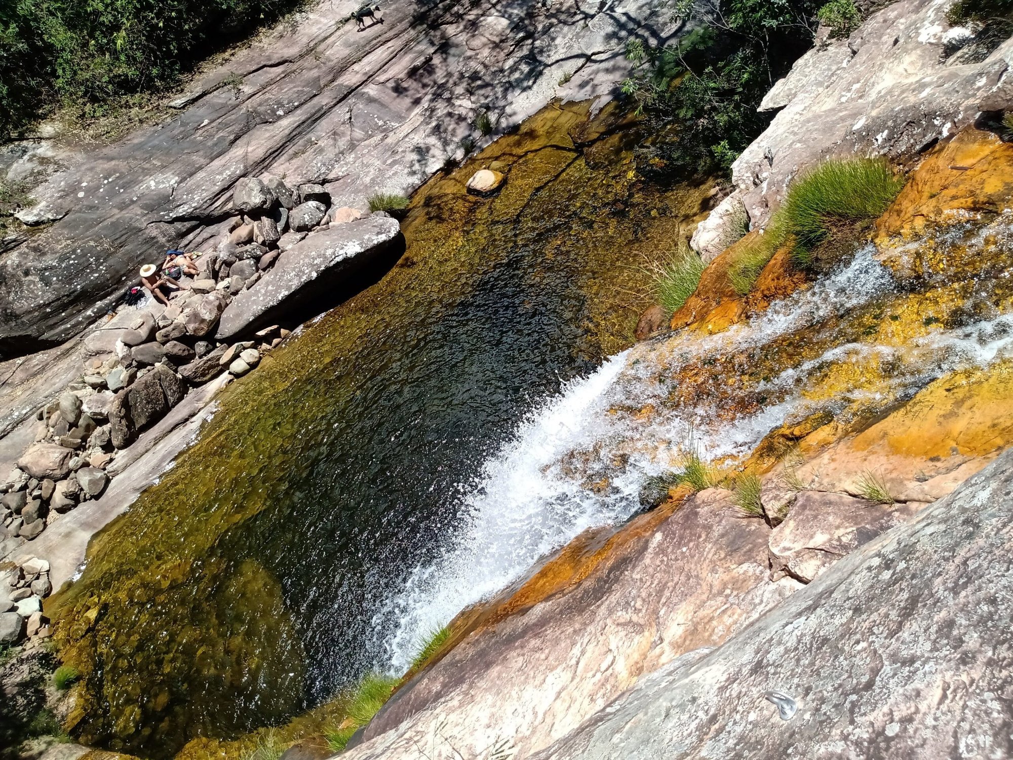 A queda forma um amplo lajeado de pedra, onde a água escorre suavemente antes de se concentrar em poços naturais. O cenário é bastante aberto, com pedras planas que permitem sentar, descansar e aproveitar o som constante da água.