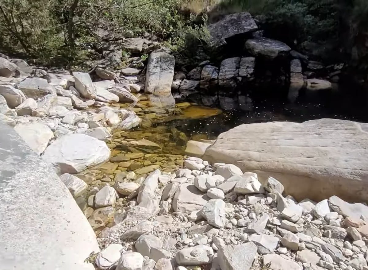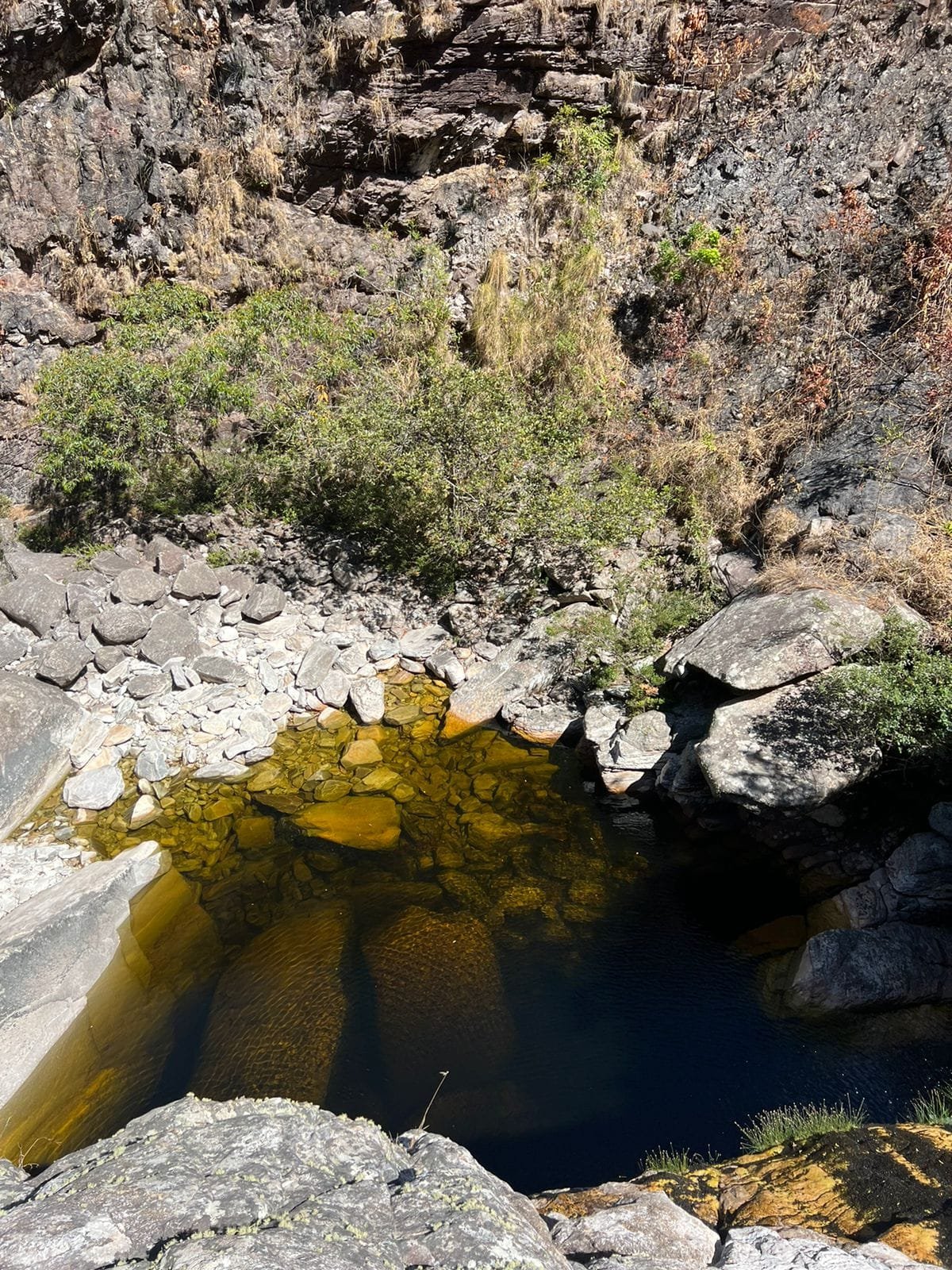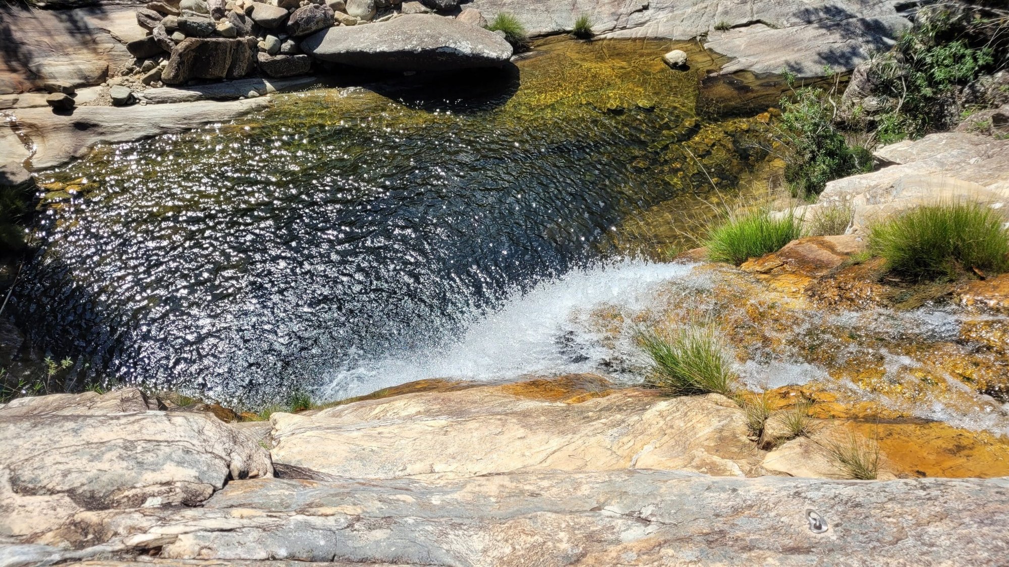 A queda forma um amplo lajeado de pedra, onde a água escorre suavemente antes de se concentrar em poços naturais. O cenário é bastante aberto, com pedras planas que permitem sentar, descansar e aproveitar o som constante da água.