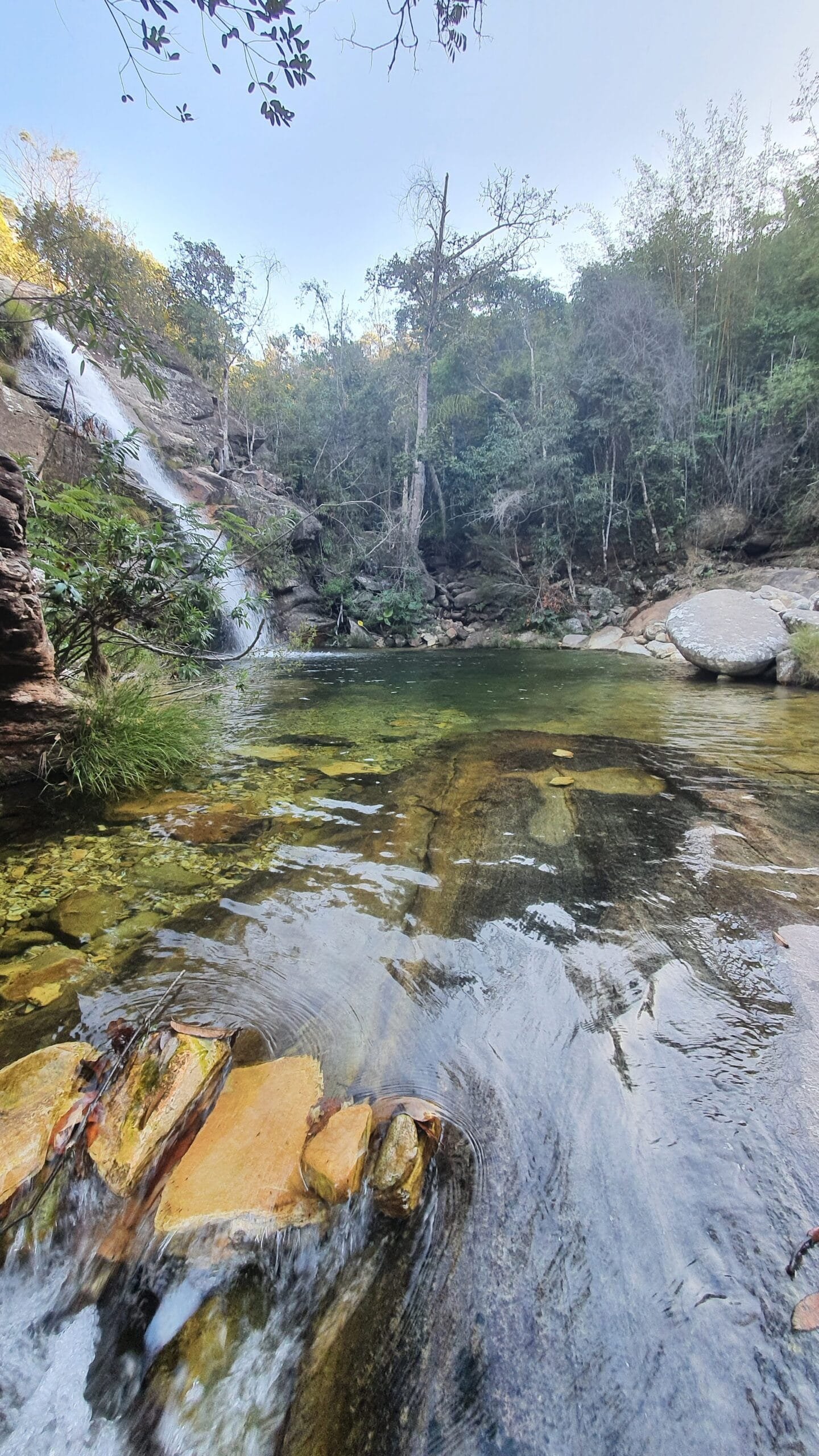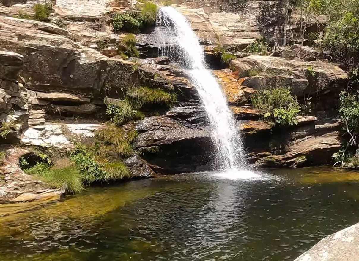 A queda forma um poço agradável para banho, com águas limpas e ambiente bastante tranquilo. O cenário combina pedras naturais, vegetação preservada e o som constante da água descendo pela rocha, criando uma atmosfera perfeita para relaxar.